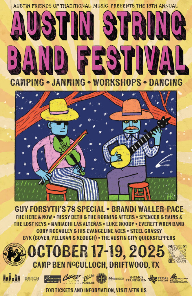 The 18th Annual Austin String Band Festival is the weekend of October 17 – 19, 2025, at Camp Ben McCulloch in nearby Driftwood, TX. Join us for a weekend of music, camping, jamming, dancing, and friends!