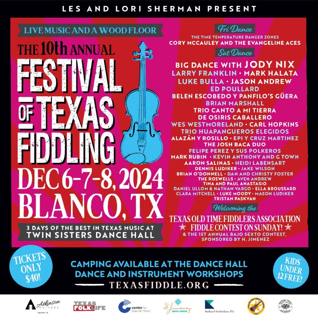 The Festival of Texas Fiddling presents the best and most diverse array of Texas fiddle music anywhere, including Old Time, Country, Western Swing, Texas Style, and Texas-Mexican (Tejano), Creole, Texas-Polish, and Son Huasteco. Always the first weekend of December at historic and beautiful Twin Sisters Dance Hall in Blanco, the FTF features all day dancing, dance & instrument workshops, jamming, vendors, food, and ice cold beer!