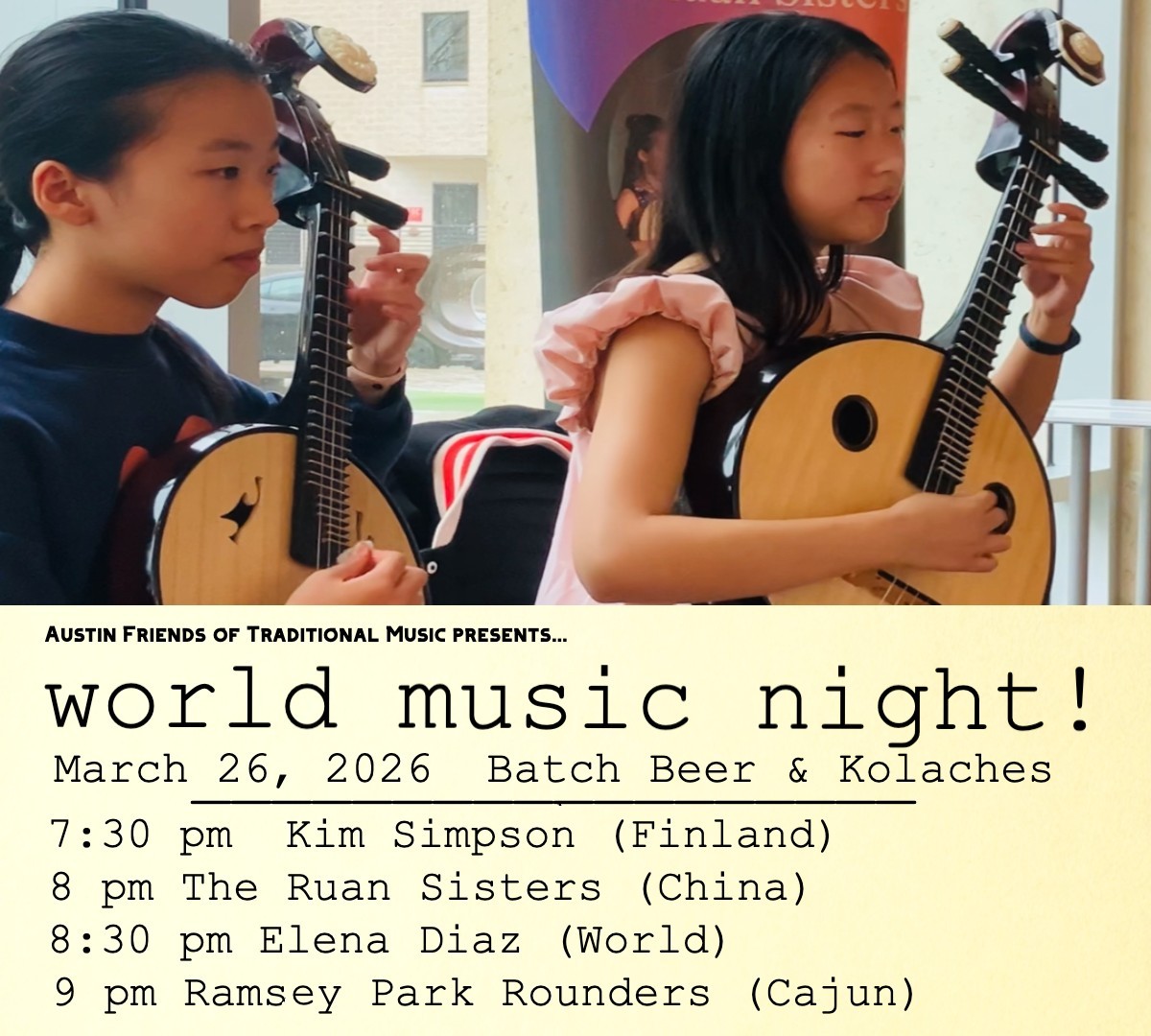 Join AFTM for another night of world music at Batch! 7:30PM - Kim J. Simpson (Finland)8:00PM - The Ruan Sisters (China)8:30PM - Elena Diaz (World)9:00PM - The Ramsey Park Rounders...